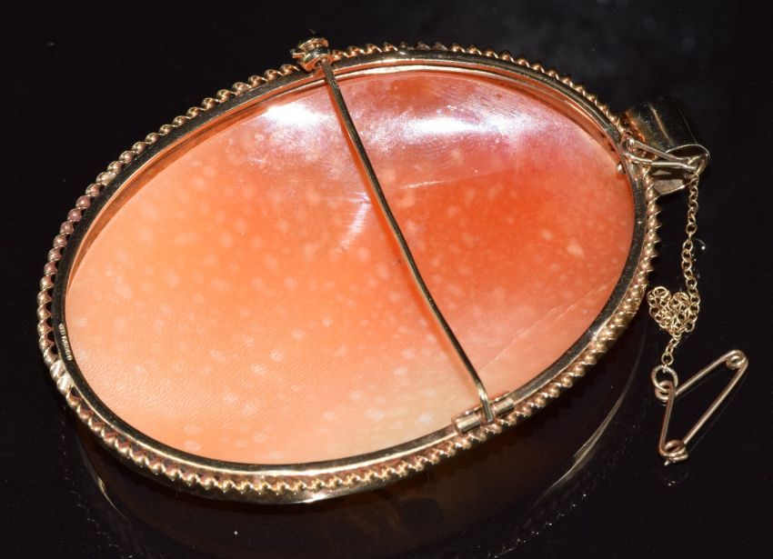 A 9ct gold pendant/brooch set with a large cameo depicting a young woman, 24.4g, 6 x 4.8cm