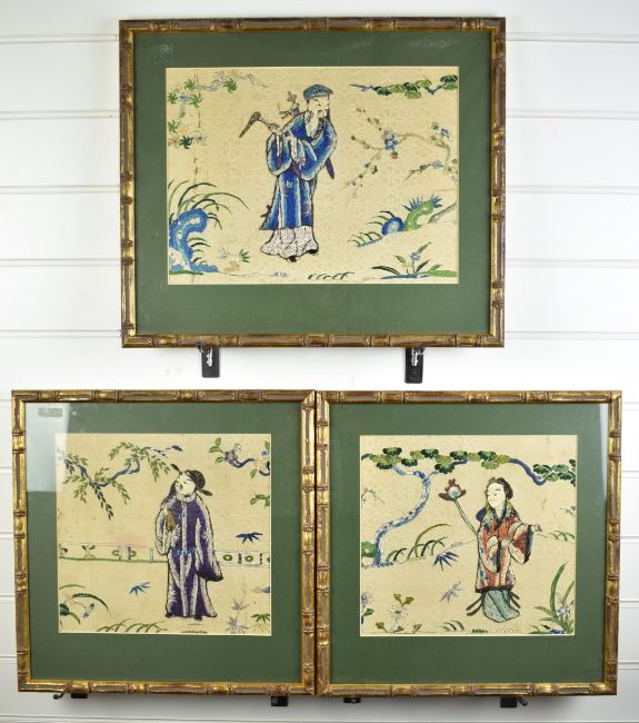 Three 19th/20thC Chinese embroideries with figural decoration, largest 29 x 38cm