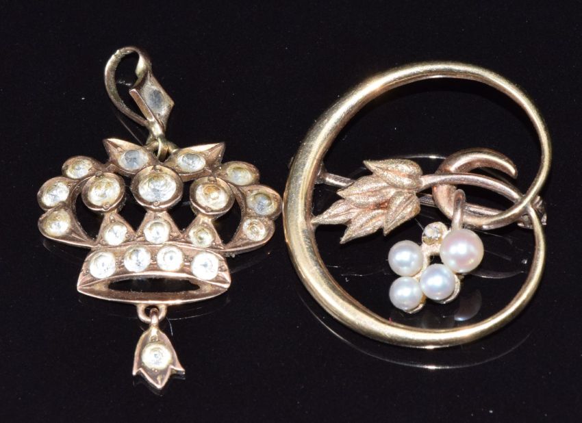 A 9ct gold brooch set with pearls and a 9ct gold pendant set with white sapphires, 6.6g