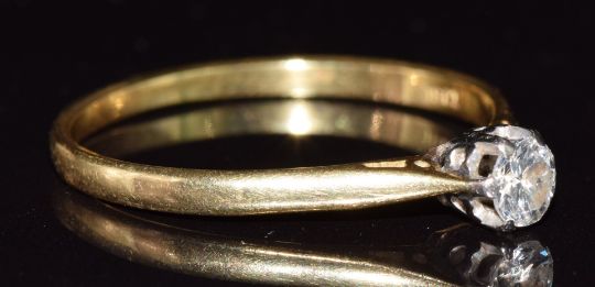 An 18ct gold ring set with a round cut diamond of approximately 0.25ct, 2.7g, size W