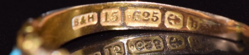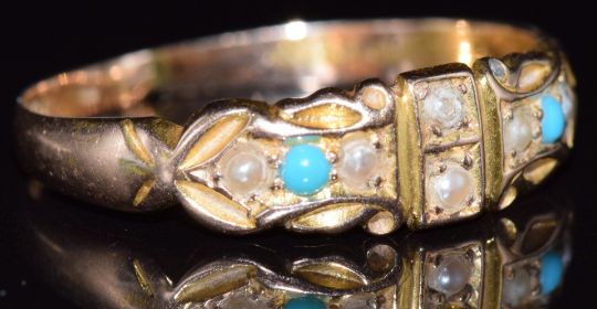 Edwardian 15ct gold ring set with seed pearls and turquoise, Birmingham 1902, 2.1g, size P