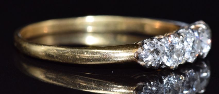 An 18ct gold ring set with five diamonds, the largest approximately 0.25ct, 3.4g, size W