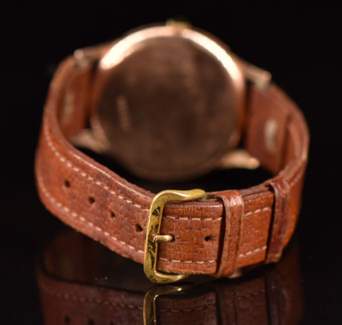 Doxa 9ct gold gentleman's wristwatch with gold hands and hour markers and silver dial, case diameter 36mm, serial number 904357.