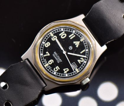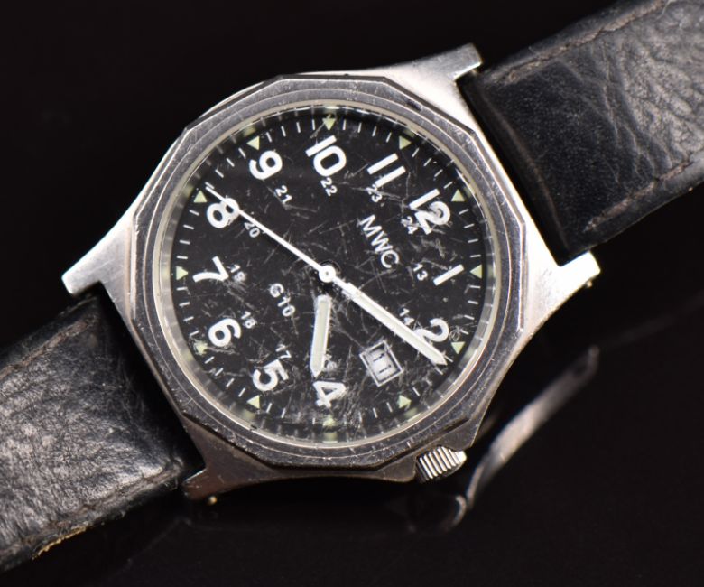 Two MWC military wristwatches ref. G10/98 and 2428-922, each with date apertures, luminous hands, Arabic numerals, black dial, stainless steel case and quartz movement, on black leather straps, largest case diameter 35mm.