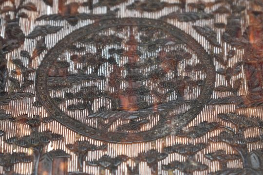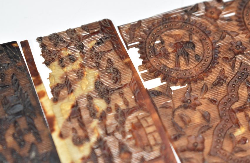 Four brisé cut tortoiseshell panels depicting birds, flowers, figures etc, largest 12 x 7cm