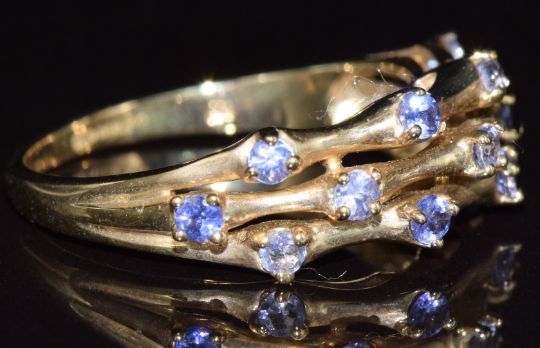 A 9ct gold ring set with tanzanites, 1.6g, size N