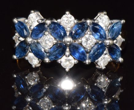 An 18ct gold ring set with diamonds and sapphires, bespoke made in Gibraltar by Don Lal in 2005, total diamond weight approximately 0.4ct and sapphire weight approximately 1.3ct, 5.3g, size L