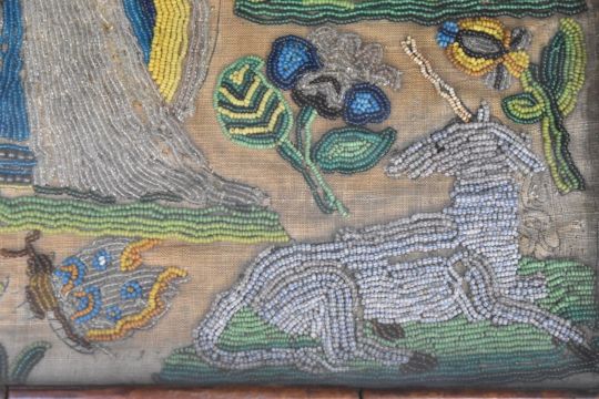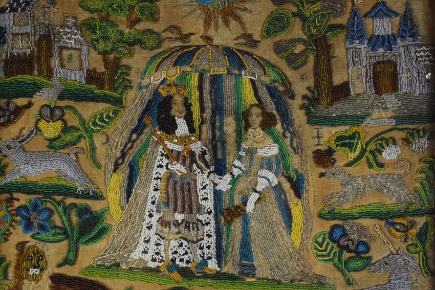17thC beadwork and embroidery of the marriage of  Charles II and Catherin Braganza, the couple with joined hands standing before a polychrome decorated gazebo, flanked by two palaces depicting houses of Stuart and Braganza, with further hunting scene, flora and fauna, in period moulded frame, c1661, 37 x 45cm, overall 44 x 52cm.Provenance: In the ownership of a prominent Midlands collector and heir for more than 50 years. The vendor remembers as a very young girl accompanying her parents to purchase the stumpwork from a large house near Exeter