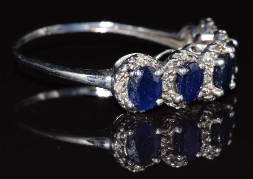 A 9ct white gold ring set with sapphire and diamonds, 3.6g, size X