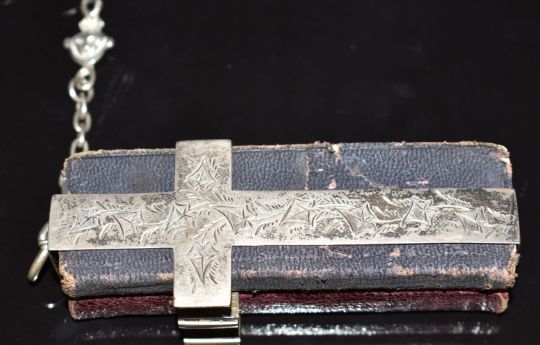 Victorian hallmarked silver chatelaine with embossed decoration to hanger, Birmingham 1890, maker's mark MR, hallmarked silver double book holder, Birmingham 1890 maker's mark JN, hallmarked silver book covers, folding comb, folding fruit knife etc