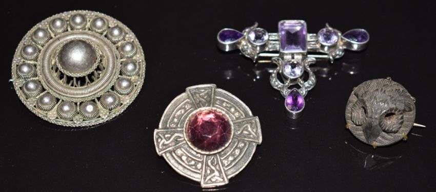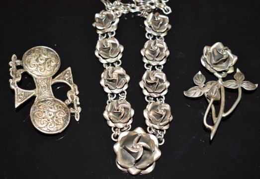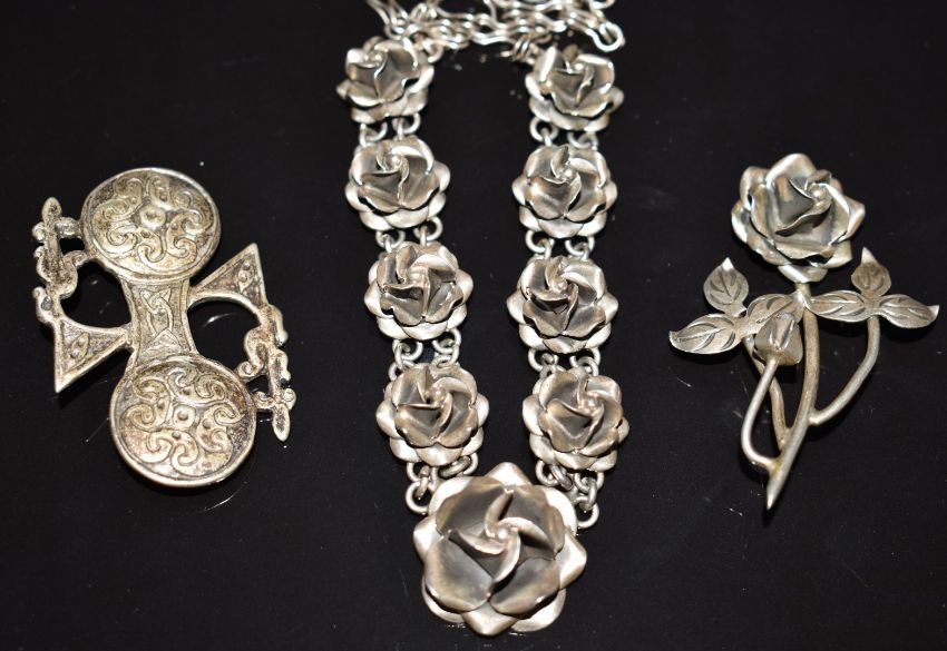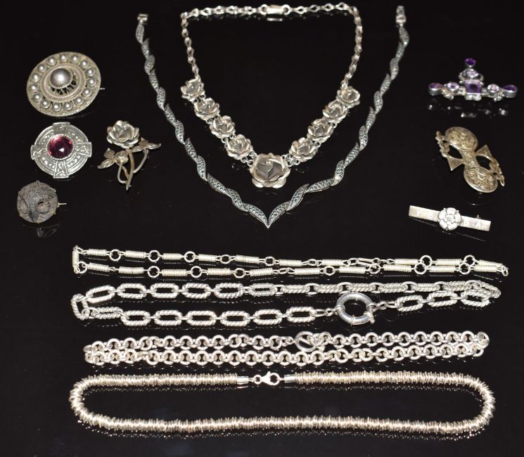 Iona silver brooch, carved jet brooch depicting an owl, four other silver brooches and six silver necklaces, 280g