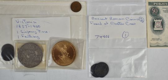 Roman Imperial Ap Antoninianus of Probus (277) Lugdunum obv imp PROBUS PF AVG radiate and cuirassed bust right, reverse TEMPORUM FELICITAS, standing right holding caduceus and Cornucopia I in exergue together with a further example of Marcus Claudius Tacitus 275-276 some silvering residue, short lived Emperor radiate cuirass head right IMP CM CLTACITUS AUG reverse gladiator in fighting stance left, with some UK coinage including silver threepenny pieces Victoria onwards, tercentenary, £2 football tokens etc
