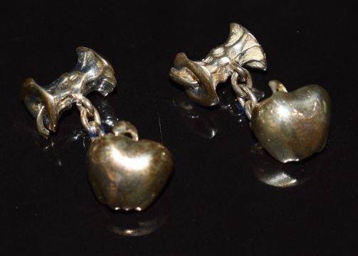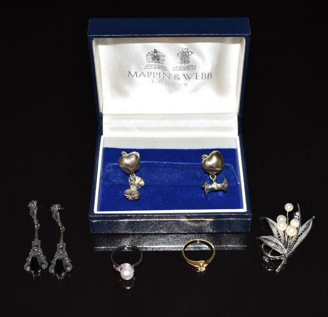 A 14ct ring set with a diamond (1.6g), silver ring and earrings and silver cufflinks in the form of apples by Mappin & Webb, etc