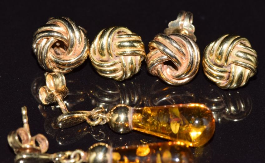 A pair of 18ct gold knot earrings (3.5g), 9ct gold knot earrings (1.7g) and a pair of 9ct gold earrings set with pressed amber