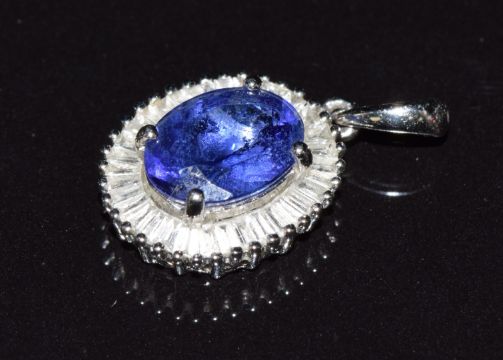 A platinum pendant set with an oval tanzanite of approximately 1.75ct surrounded by baguette cut diamonds, 2.5g