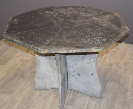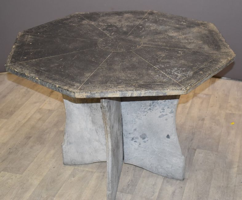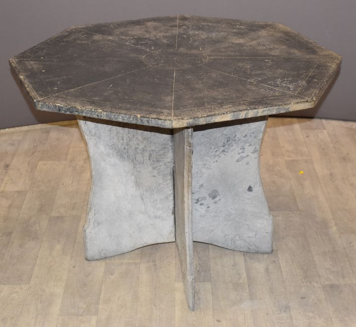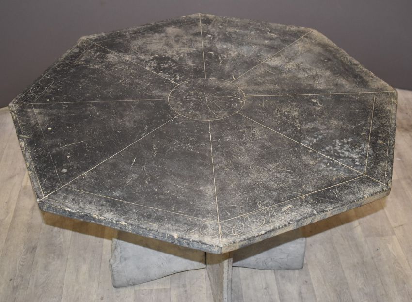 19thC likely Irish Valentia slate table, the octagonal top having engraved decoration, supported on two slot together leg sections, width 102, height 75cm