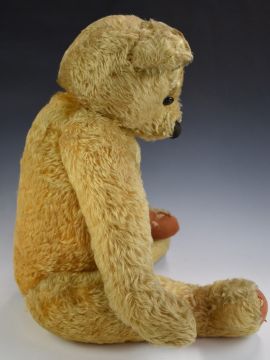 Chad Valley Teddy Bear with squeaker, blonde mohair, soft filling, disc joints, felt pads, stitched features and original label to chest, 75cm tall.