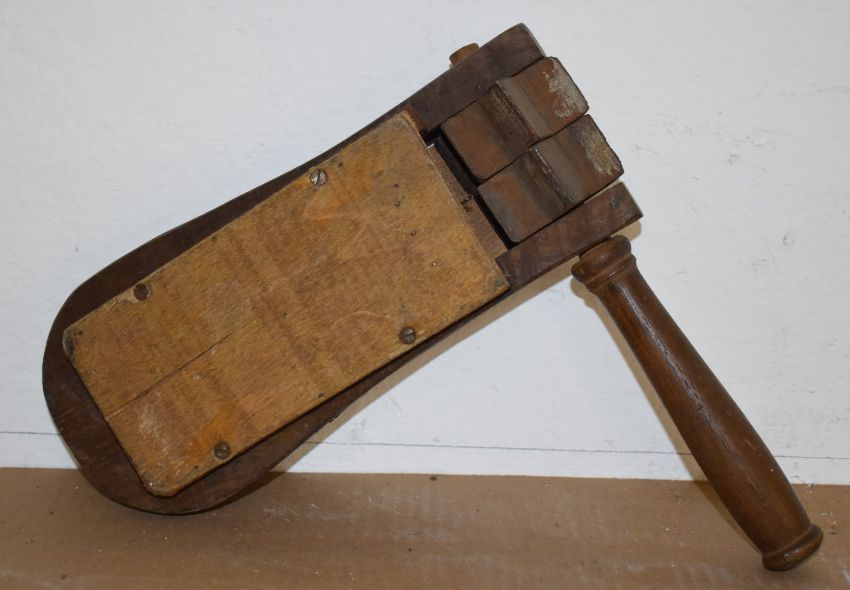 19thC or early 20thC wooden rattle crow scarer or football cry, length 26cm