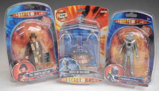 A collection of Doctor Who action figures and toys including Series 1 Figure Set, Dalek Collectors Set 1, 12" Judoon Captain and Corgi 40th Anniversary Gift Set, all in original boxes.