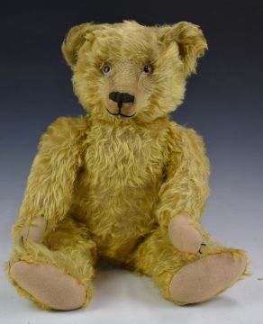 English Teddy bear with growler, blonde mohair, shaved snout, straw filling, disc joints, felt pads and stitched features, 60cm tall.