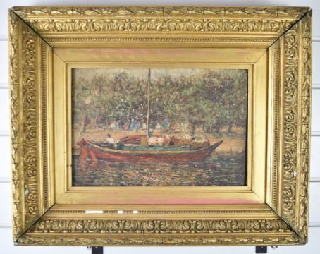 Likely Andrew Colley (1859-1910) oil on board impressionist landscape boat at a busy quayside, 24 x 35cm, in ornate gilt frame