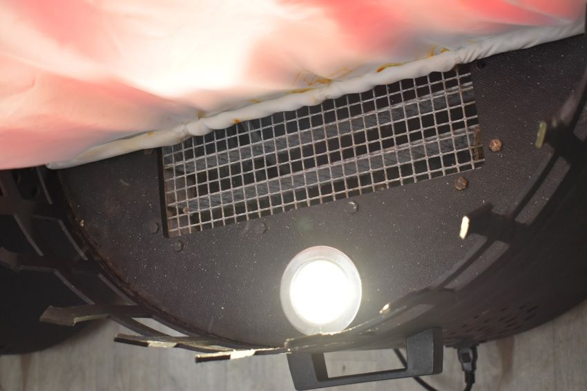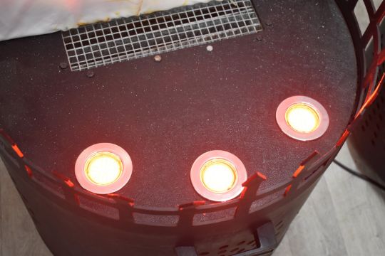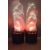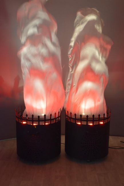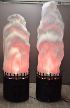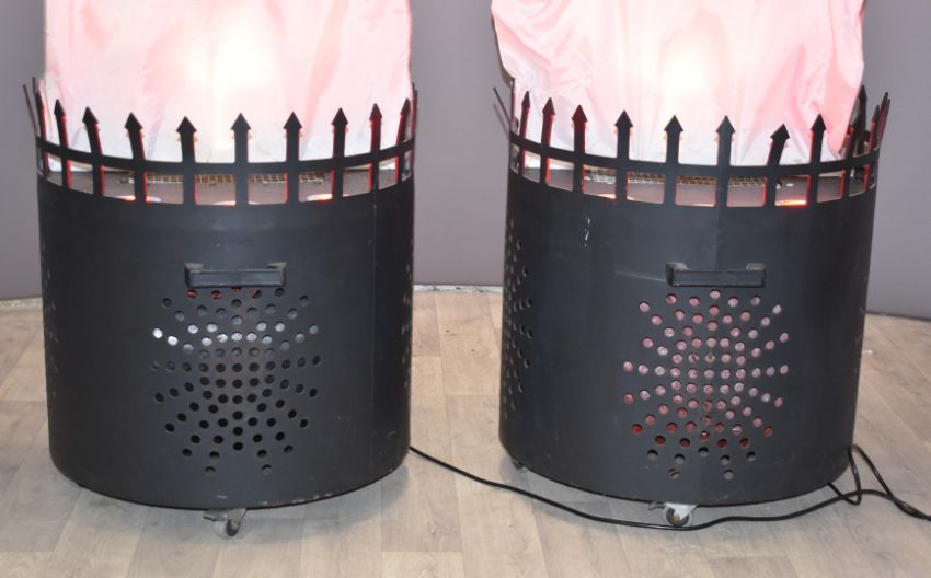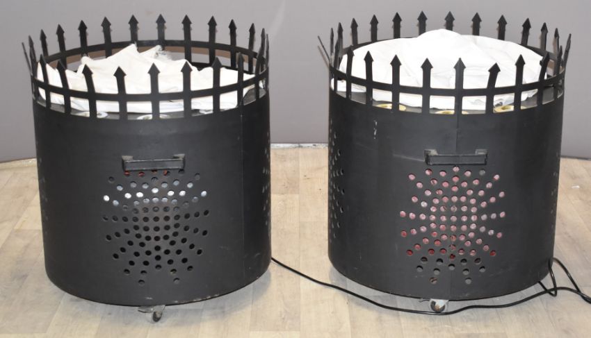 Pair of fire pits, with fabric fan driven 'flames' being lit by bulbs in the base, bases D62 x H67cm