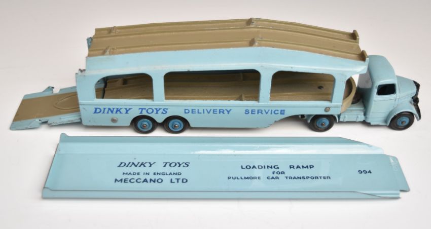 Dinky Toys diecast model Pullmore Car Transporter with blue cab, trailer and hubs, 982, complete with loading ramp, in original box.