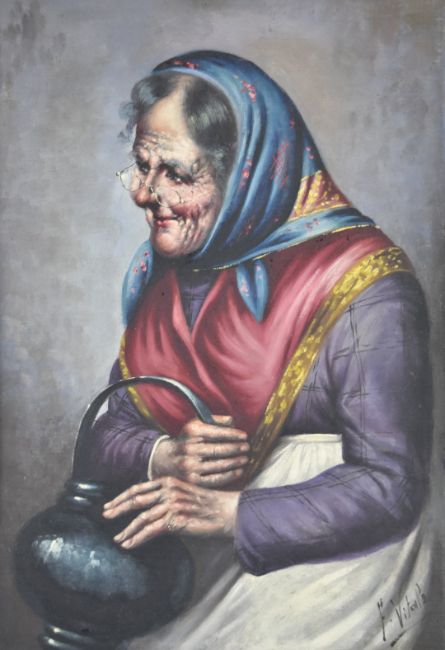 Ferruccio Vitale (Italian 1875-1933), pair of portraits of a lady holding a vessel and gentleman lighting a pipe, both signed lower right, 37 x 26cm, in gilt frames