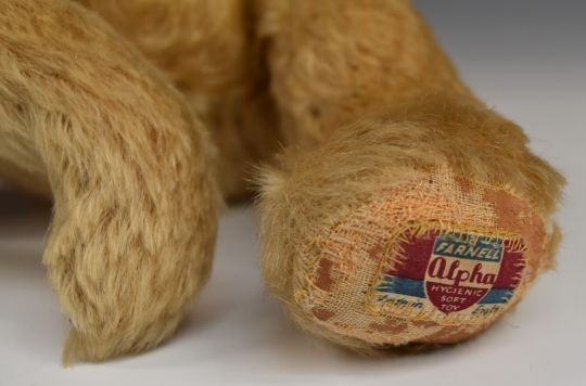 Farnell Alfa Teddy bear with blonde mohair, soft filling, disc joints, cloth pads, stitched features and original label to foot, 41cm tall.