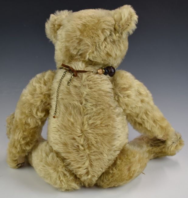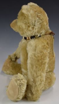 Farnell Teddy bear with growler, blonde mohair, shaved snout, straw filling, disc joints, cloth pads and stitched features, 50cm tall.