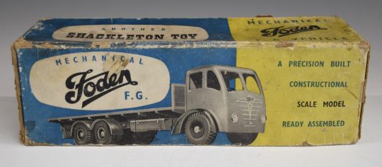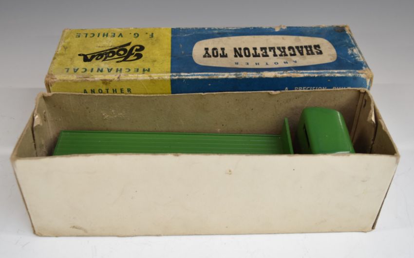 Shackleton Toys clockwork mechanical Foden FG flat bed truck with green cab and bed, red wheel arches and silver hubs, in original box with key.