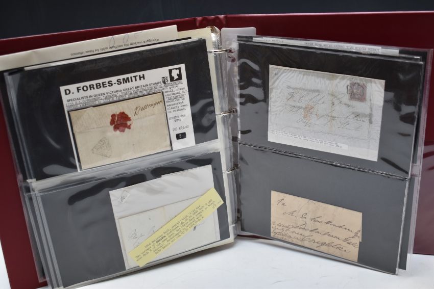 A folder of GB postal history from pre stamp covers to King George V including 1d black on cover, 1841 2d blues etc along with a single used 1d black on album page (four clear margins) and a MM 1929 £1 PUC
