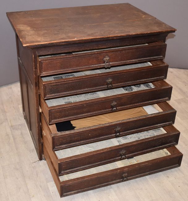 Oak plan chest or chest of six drawers, with Art Nouveau or Arts and Crafts style handles, W99 x D69 x H87cm