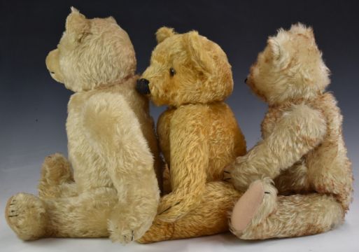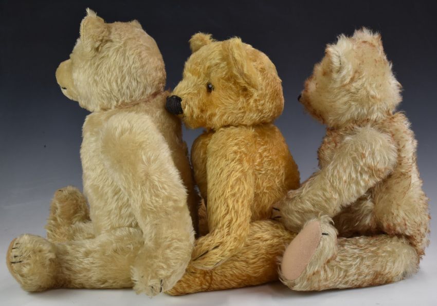 Three Chad Valley, Steiff or similar Teddy bears one with growler, tipped blonde mohair, disc joints, straw or similar filling, felt pads and stitched features, one with growler, blonde mohair, shaved face and snout, disc joints, straw or similar filling, stitched features and felt pads and one with golden mohair disc joints, soft filling, felt pads and stitched features, largest 54cm tall.