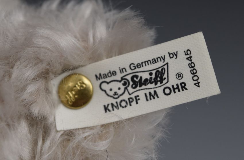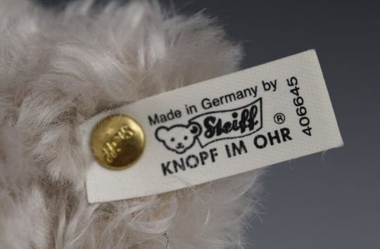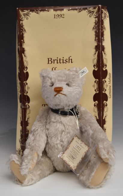 Steiff 1911 Replica Teddy bear with growler, grey mohair, disc joints, cloth pads, stitched features and original labels, 35cm tall, limited edition of 3000, in original box with certificate.