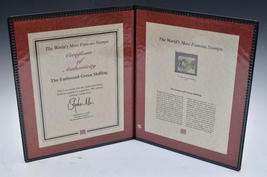 Two Westminster folders containing an 1840 penny black, and 1841 2d blue and 1/ green embossed issue, all three used and three margins