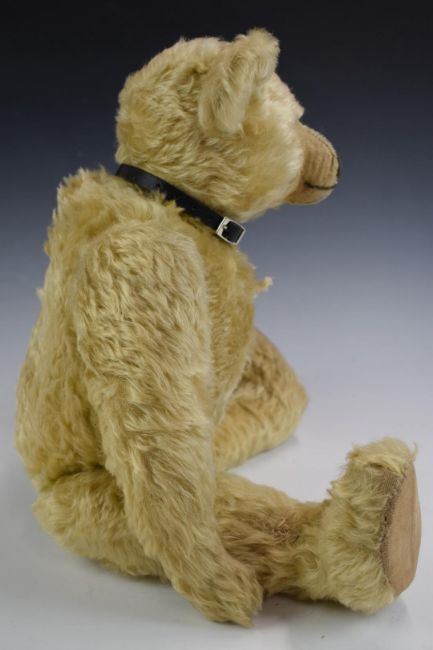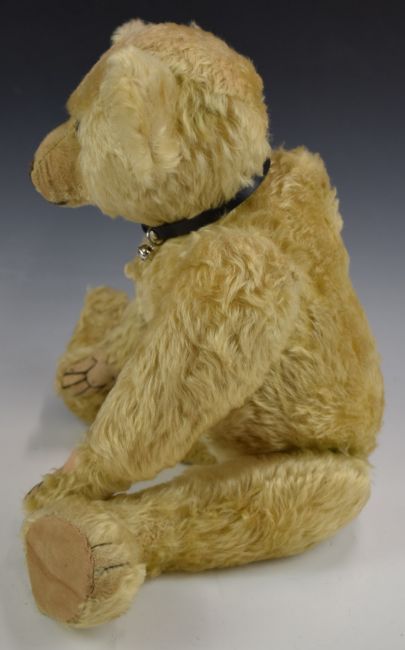 Farnell Teddy bear with blonde mohair, shaved snout, part straw filling, disc joints, cloth pads and stitched features, 56cm tall.