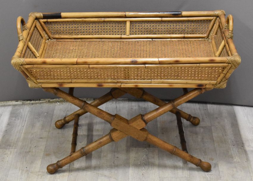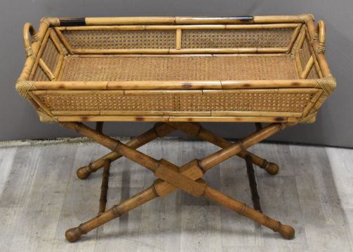 Wicker and bamboo butler's tray on X shaped stand, L87 x D56 x H88cm