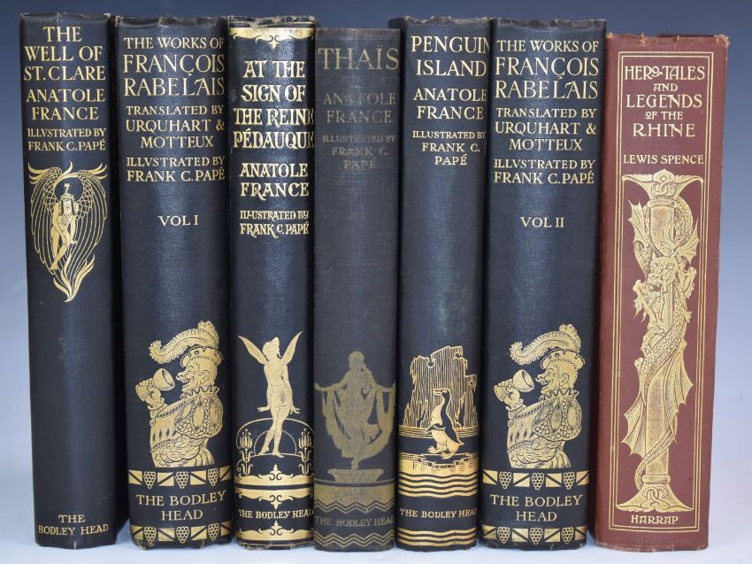 Books Illustrated by Frank C. Pape including The Complete Works of Francois Rabelais 1927 in 2 volumes limited to 4300 copies; The Well of Saint Clare 1928; Penguin Island 1926; Thais 1930 and At The Sign of The Reine Pedauque 1922 by Anatole France - published Bodley Head in gilt decorated cloth bindings WITH Hero Tales and Legends of The Rhine by Lewis Spence 1915 with colour plates in gilt cloth (7)
