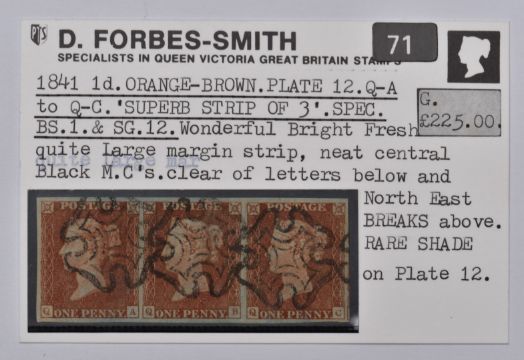 GB 1841 1d orange-brown strip of three, four margins with three neat Maltese Crosses