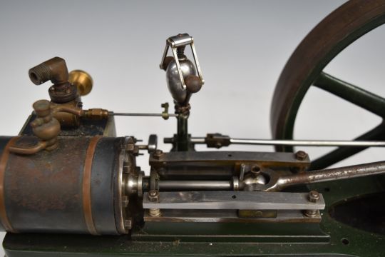 Single cylinder horizontal live steam engine with fly ball governor and feed pump, 36cm long.