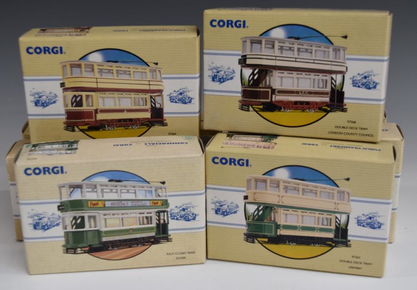Twenty-two Corgi Classics diecast model buses, coaches, trams and commercial vehicles and vehicle sets including Terry's Chocolates, Whitbread, Public Transport, Commercials etc, all in original boxes.