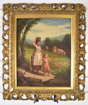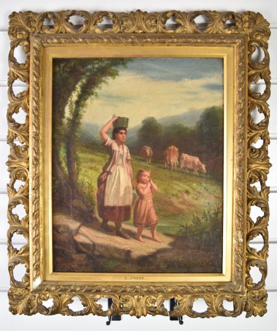 Pierre Edouard Frere (1819-1886) oil on canvas lady and young girl carrying water with cattle grazing beyond, signed lower right 38 x 30cm, in ornate gilt frame