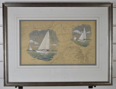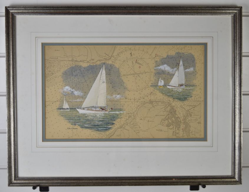 Colin Baxter watercolour of sailing yachts on a shipping chart of Cowes, Isle of Wight, 23 x 39cm