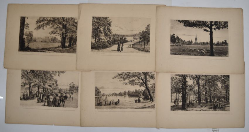 Tristram J Ellis set of six etchings of Kensington Gardens and Hyde Park, with original boards and title sheet, 41 x 55.5cm overall