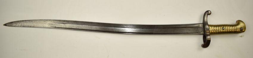 French 1842 pattern sabre bayonet with brass grip, internal coiled spring, crossguard stamped 1324, 57.5cm T form yataghan blade with 1842 manufacture date inscribed and scabbard. PLEASE NOTE ALL BLADED ITEMS ARE SUBJECT TO OVER 18 CHECK ON COLLECTION OR DELIVERY