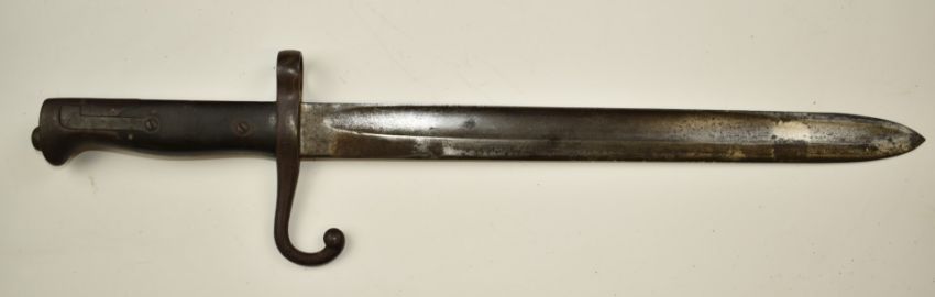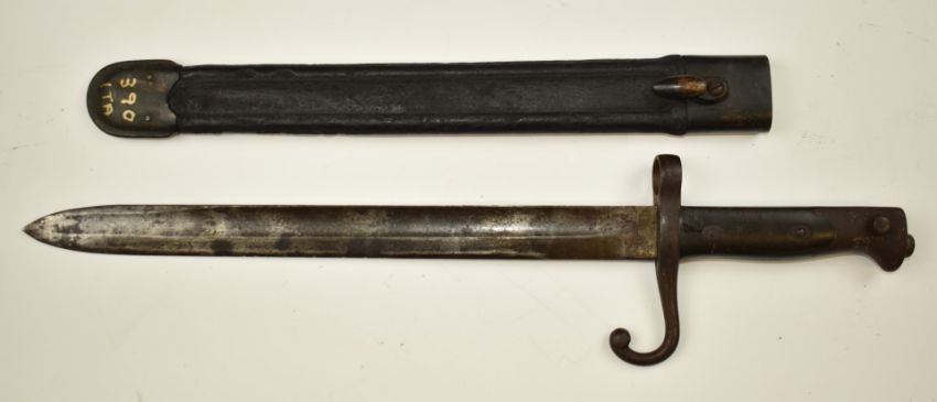 Italian 1870 pattern Type Z Vetterli bayonet with short lead spring, 31cm fullered blade and scabbard stamped Terni 1890. PLEASE NOTE ALL BLADED ITEMS ARE SUBJECT TO OVER 18 CHECK ON COLLECTION OR DELIVERY