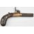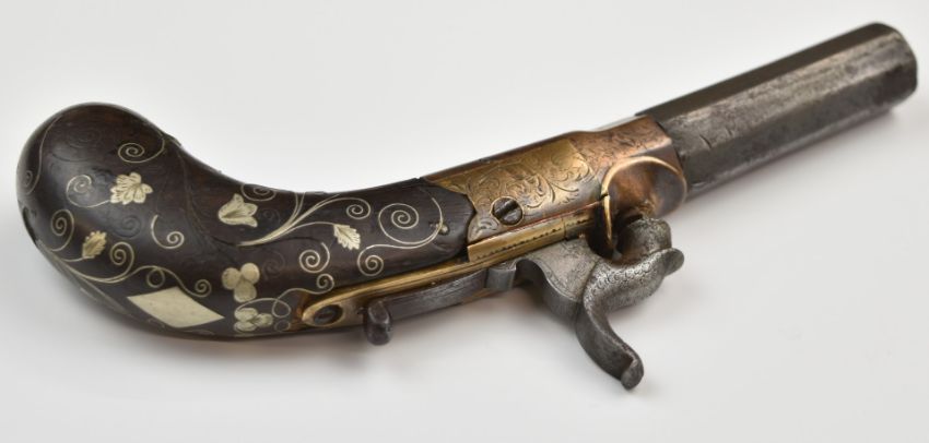 Percussion hammer action pocket pistol with engraved brass action, engraved floral silver wire inlay to the grip, vacant wrist cartouche, folding trigger, thumb slide safety and 2.25 inch smooth bored turn-off octagonal barrel, overall length 17cm.