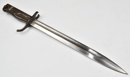 German Ersatz 88/98 pattern knife bayonet with pressed steel hilt and upswept quillon, 31cm fullered blade, scabbard and frog, some paint remaining on both handle and scabbard. PLEASE NOTE ALL BLADED ITEMS ARE SUBJECT TO OVER 18 CHECK ON COLLECTION OR DELIVERY