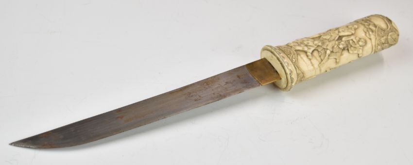 Bone hunting knife / dagger with fine carving to grip, 20cm blade and sheath. PLEASE NOTE ALL BLADED ITEMS ARE SUBJECT TO OVER 18 CHECK ON COLLECTION OR DELIVERY